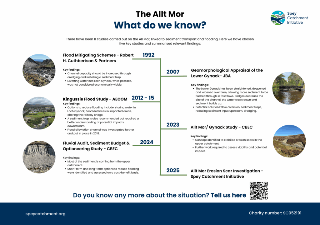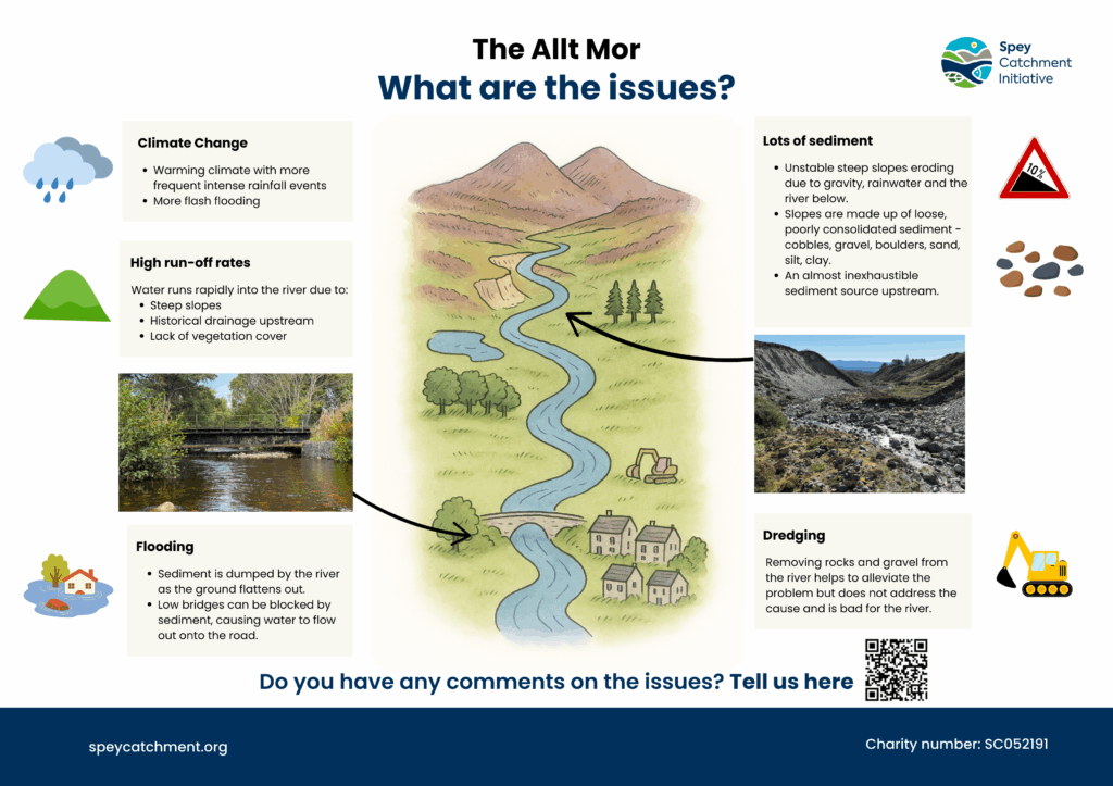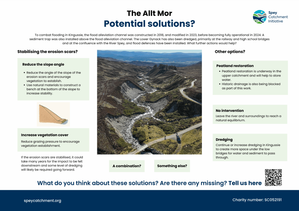 The information and perspectives gathered at the consultation will help shape the next stage of the investigation as we continue to explore how erosion scars on the Allt Mor contribute to sediment build-up and flood risk in Kingussie, and what actions could help reduce these impacts while enhancing the local environment.